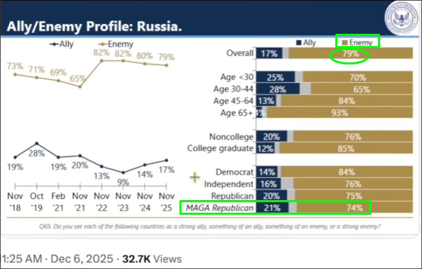 In tegenstelling tot wat Trump in het nieuwe NSS schrijft, ziet de bevolking van de VS Rusland nog wél als een vijand. Zelfs de MAGA-republikeinen vinden voor 74% dat Rusland geen bondgenoot is maar wel een vijand.