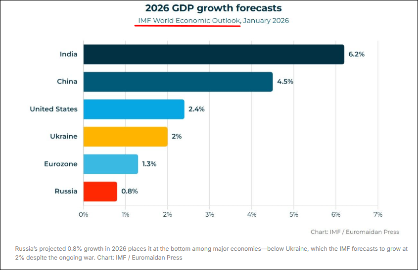 Het IMF verlaagde maandag de groeiprognose voor Rusland in 2026 naar 0,8%, terwijl het voor Oekraïne, dat nog steeds onder Russisch bombardement ligt, een groei van 2% voor dit jaar voorspelt.