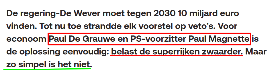 -Drie: er worden massaal subsidies gegeven aan het bedrijfsleven. Die bedragen volgens de Nationale Bank 25 miljard euro. Dat is meer dan de totale uitgaven voor onderwijs in België (24 miljard euro). Daar komen nog de miljarden aan subsidies bij die de Nationale Bank uitreikt aan de banken. Sommige van die subsidies kunnen zinvol zijn, bijvoorbeeld subsidies voor innovatie. Een groot deel is dat niet en komt uiteindelijk terecht in de zakken van de aandeelhouders van de bedrijven.