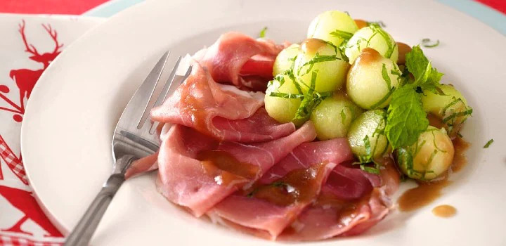 - Verdeel de parmaham over de borden en leg ze een beetje 'geribbeld' neer zodat er wat hoogte ontstaat, dit geeft een leuke uitstraling. Schep er een hoopje meloenbolletjes (met munt) bij en lepel de dressing erover. Garneer eventueel nog met de rest van de munt.