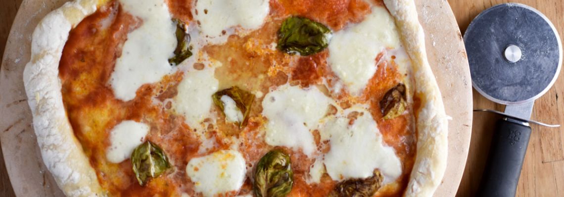 Na 2 uur; zorg dat er wat bloem op het aanrecht ligt. Leg een gerezen bol deeg op het aanrecht en druk er met je vuist in. Draai om en druk er opnieuw met je vuist in. Til het deeg op en draai tussen je duim en je andere vingers rond. De pizzabodem begint zich nu te vormen. Mocht er een gaatje ontstaan, dit is niet erg. Pak in dat geval een stukje van de zijkant en plak het als een pleister op het gat. Leg het deeg alvast op de pizzasteen of de bakplaat. Het is zonder pizzaschep namelijk lastig om de pizza te verplaatsen zonder dat ie uit elkaar valt.