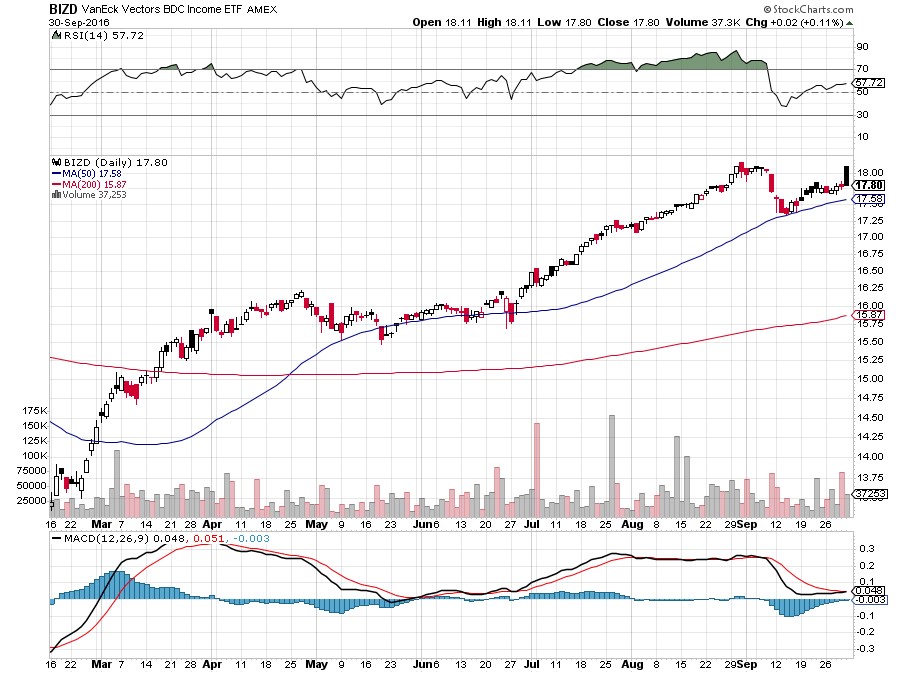 Het is dan ook niet heel verrassend dat beleggers sinds dit jaar meer en meer interesse hebben gekregen in BDC’s. Dat is duidelijk zichtbaar in bijvoorbeeld de VanEck Vectors BDC Income ETF. Een flinke stijging, sinds ongeveer maart dit jaar: