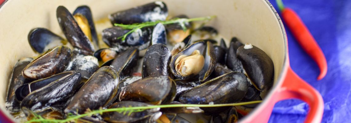 4. Voeg voorzichtig de mosselen toe en breng weer aan de kook. Zet de deksel op de pan en kook de mosselen in circa 5 minuten gaar.