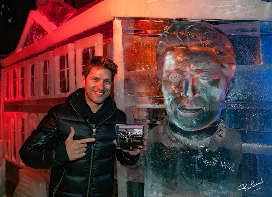 Als je luistert naar Warme wintersongs, hoor je een muzikale mix van ballades, mid- en uptempo songs. ‘We hebben 12 liedjes opgenomen die allemaal een warm gevoel uitstralen. Besef welke luxe we hebben. Wees blij en dankbaar. Dat positieve gevoel komt tot uiting in “Zwart”, “Voor haar”, “Zo mooi” en “Onder mijn huid”. De boodschap die ik meegeef, is dat mensen moeten leven in het heden en niet alleen in het verleden of in de toekomst. Dromen zijn goed en je mag heel groot dromen, maar daar mag het niet bij blijven. Zijn er zaken die je wil veranderen, dan moet je dat nu doen. We leven in het “nu” en we moeten beseffen dat niet alles vanzelfsprekend is. Dat heb ik geleerd door mijn deelname aan Expeditie Robinson, een paar jaar geleden. Na afloop van de opnames had ik zoiets van; “Damn, wij zijn lucky bastards in onze Westerse wereld.” Ik heb positivisme in overvloed. Het is mijn benzine, mijn drijfveer die me laat leven.’ (foto: Gene bij zijn ijssculptuur op Ice Magic Hasselt (c) Roland Hermans)