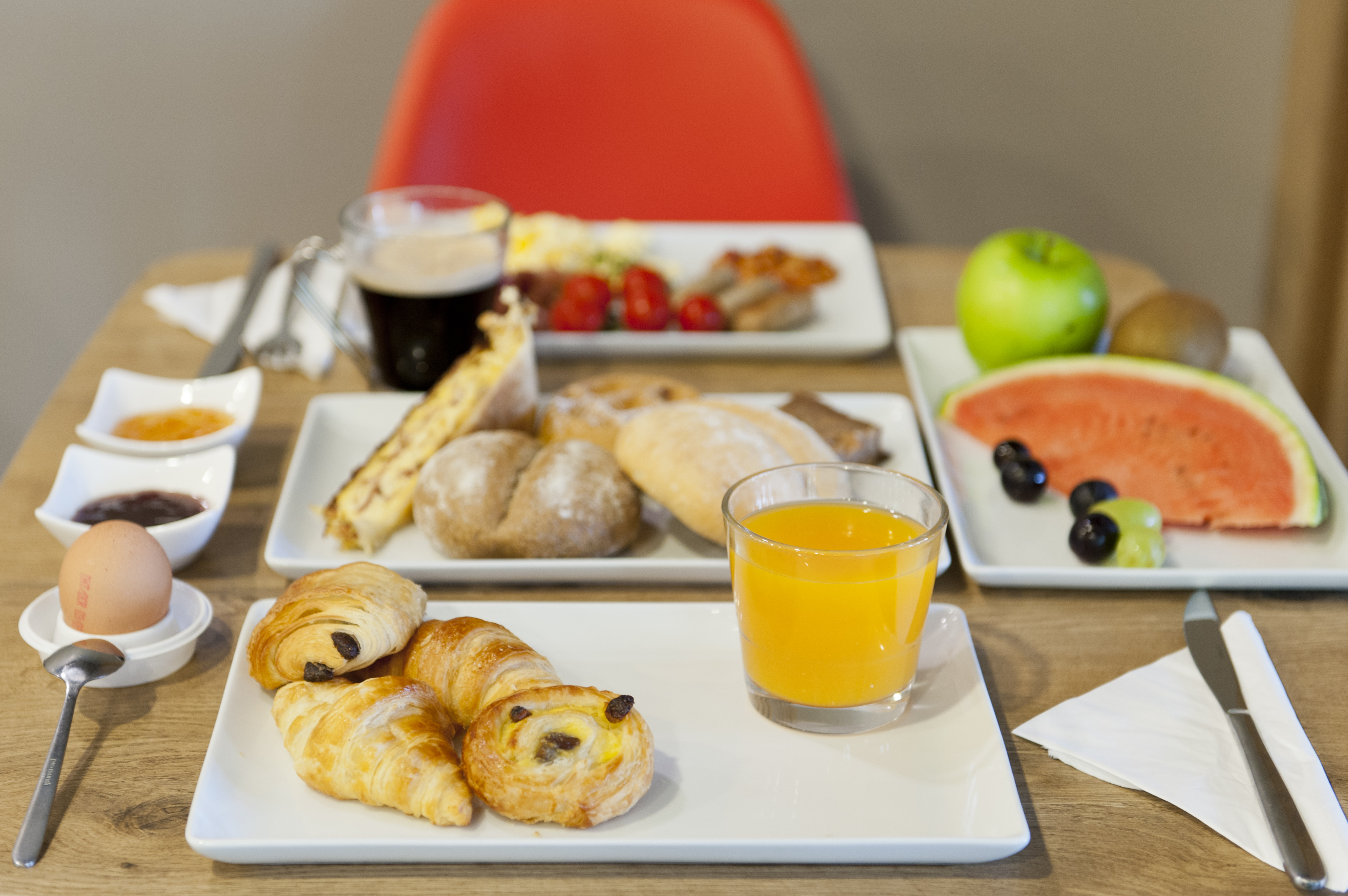 Het Ibis-ontbijt bestaat uit een ontbijtbuffet waar je tussen 06.30 en 10.00 zoveel kunt eten als je wilt. Alle elementen van een continentaal ontbijt zijn aanwezig, aangevuld met lokale specialiteiten. Het wordt geserveerd in een open en kleurrijke ruimte met uitzicht op het grote terras.