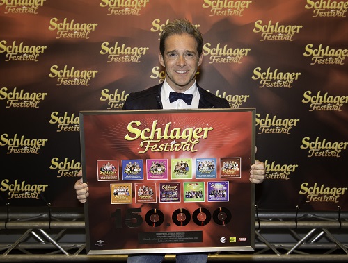 De voorbije weekends werd er niet alleen geklonken op de mooie festivaldagen, Christoff verraste de organisatie backstage met een ‘Special Award’, die hij namens platenfirma Top Act / Universal Music mocht uitreiken voor de uitzonderlijke verkoop van meer dan 150.000 cd’s, gespreid over 12 edities. ‘Vorige week ontvingen we onze 500.000ste bezoeker en vandaag mogen we opnieuw toasten. Ook al leven we in een digitaal tijdperk, onze mensen blijven jaar na jaar kiezen voor het fysieke product. De investeringen die het platenlabel doet in de Schlagerfestival-cd’s, renderen en worden geapprecieerd door het publiek. Ook dit jaar wordt er opnieuw uitgepakt met een 3-cd-box, inclusief een bonus polonaisemix’, klinkt het bij de Schlagerfestivalorganisatie. (Foto: (c) Roland Hermans)