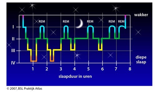REM staat voor ‘rapid eye movement’, en verwijst naar de snelle oogbewegingen die je maakt. Tijdens deze fase zijn je ademhaling en hartslag onregelmatig en ga je dromen. De REM-slaap is belangrijk om gebeurtenissen en informatie van de voorbije dag te ordenen en te verwerken. Je hersenen zijn dan ook heel actief gedurende de droomslaap, waardoor je plotsklaps klaarwakker bent als je ontwaakt tijdens deze fase.