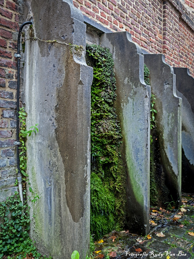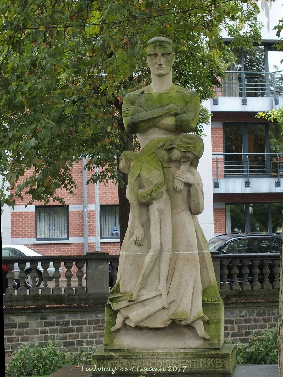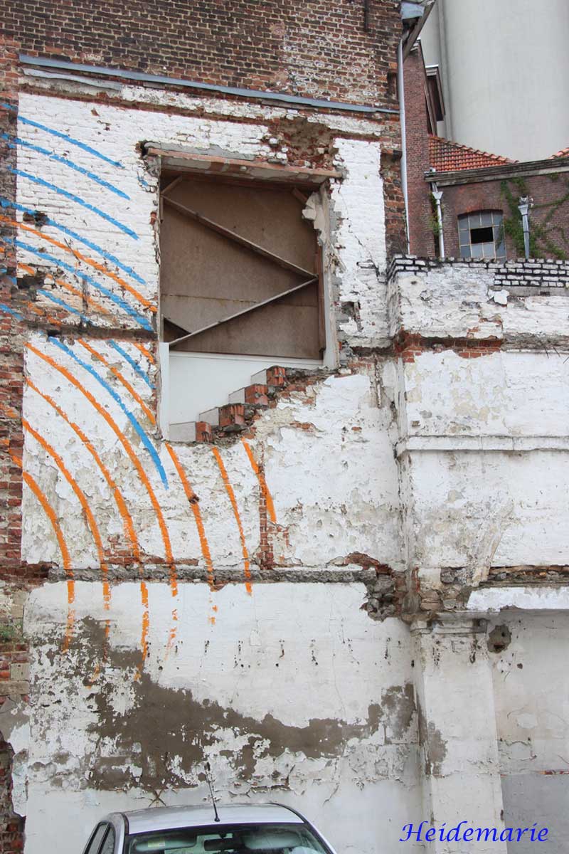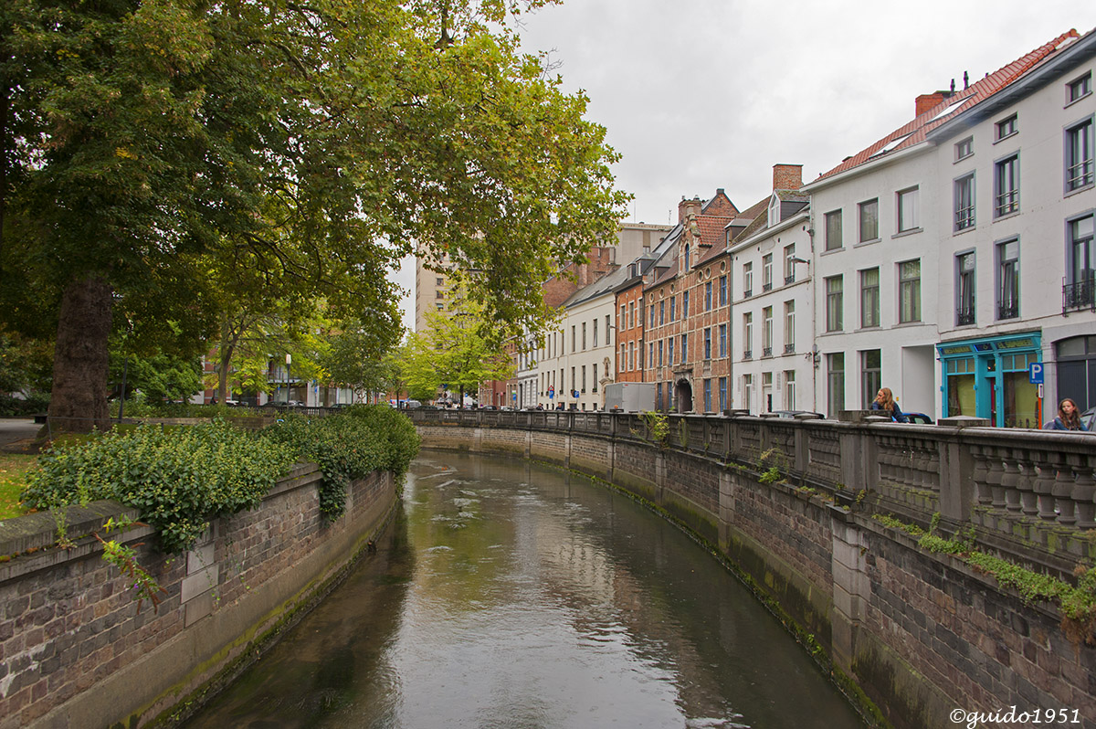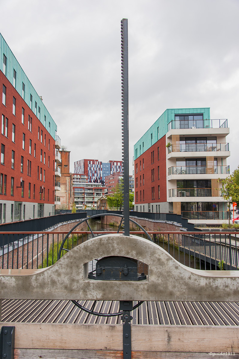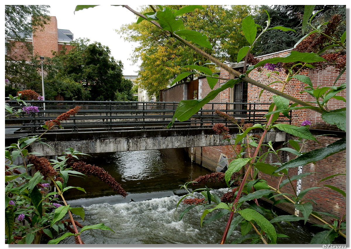 Het was dus onder druilerige regenwolken dat de groep samenkwam aan het station van Leuven. Na de traditionele groepsfoto getrokken te hebben aan het vredesmonument op het Martelarenplein, loodste de ervaren Leuvenkenner Marsje ons via de Diestsevest naar de Tweewaters. Deze plaats is zo genoemd omdat twee waterlopen (de Dijle en de Vunt) er letterlijk naast elkaar lopen, links en rechts van een wandelpad. Een prachtig stukje natuur midden in de stad en aan de rand van een oude industriële zone.