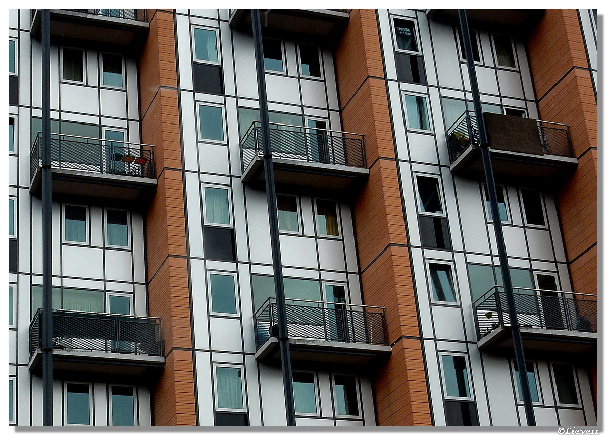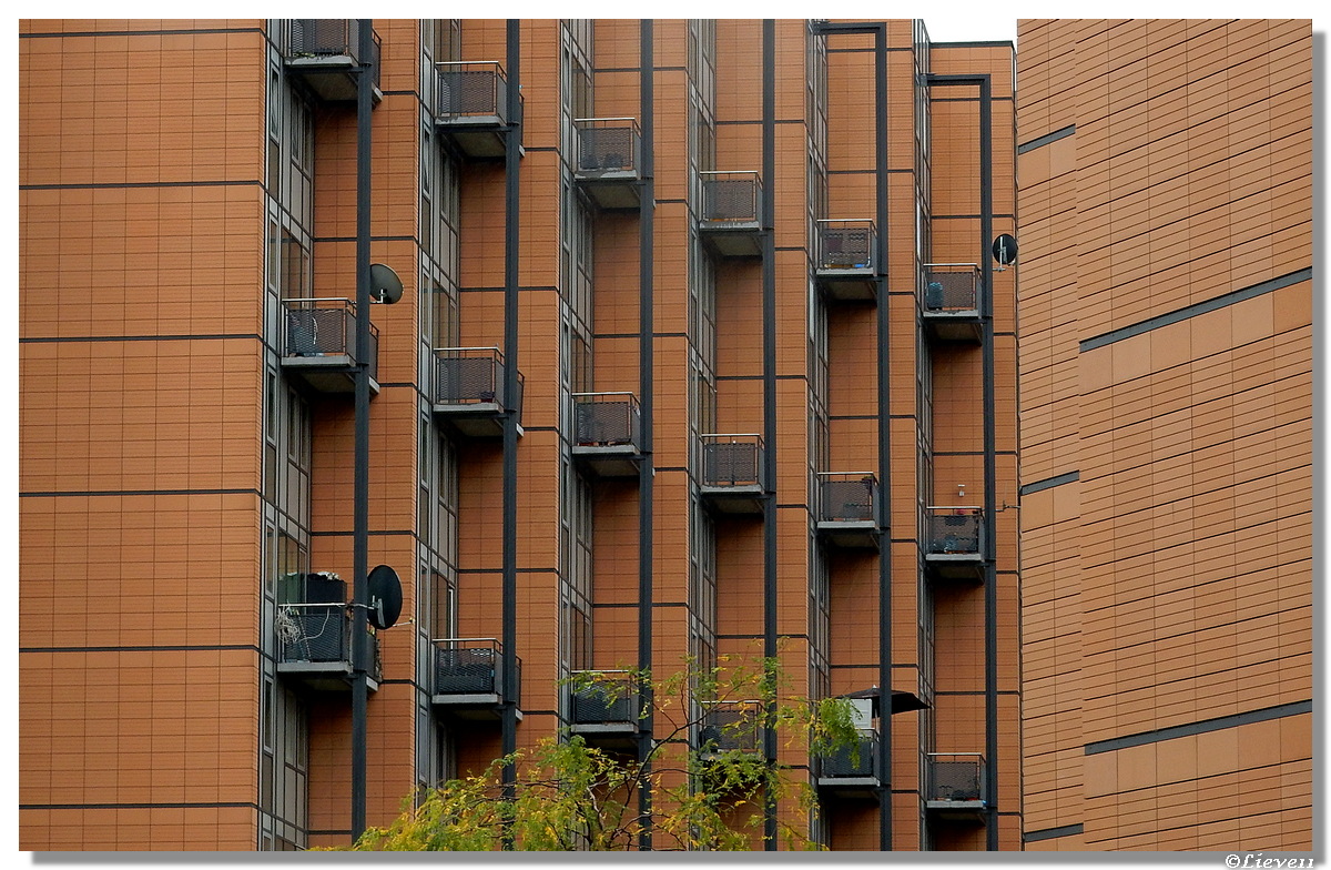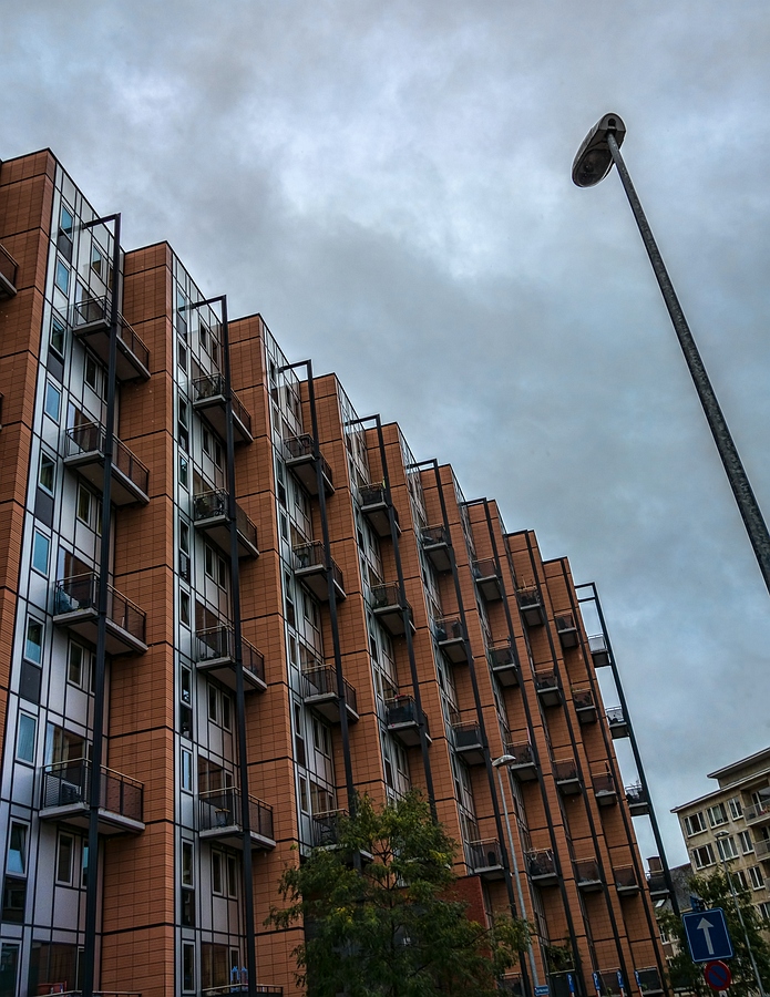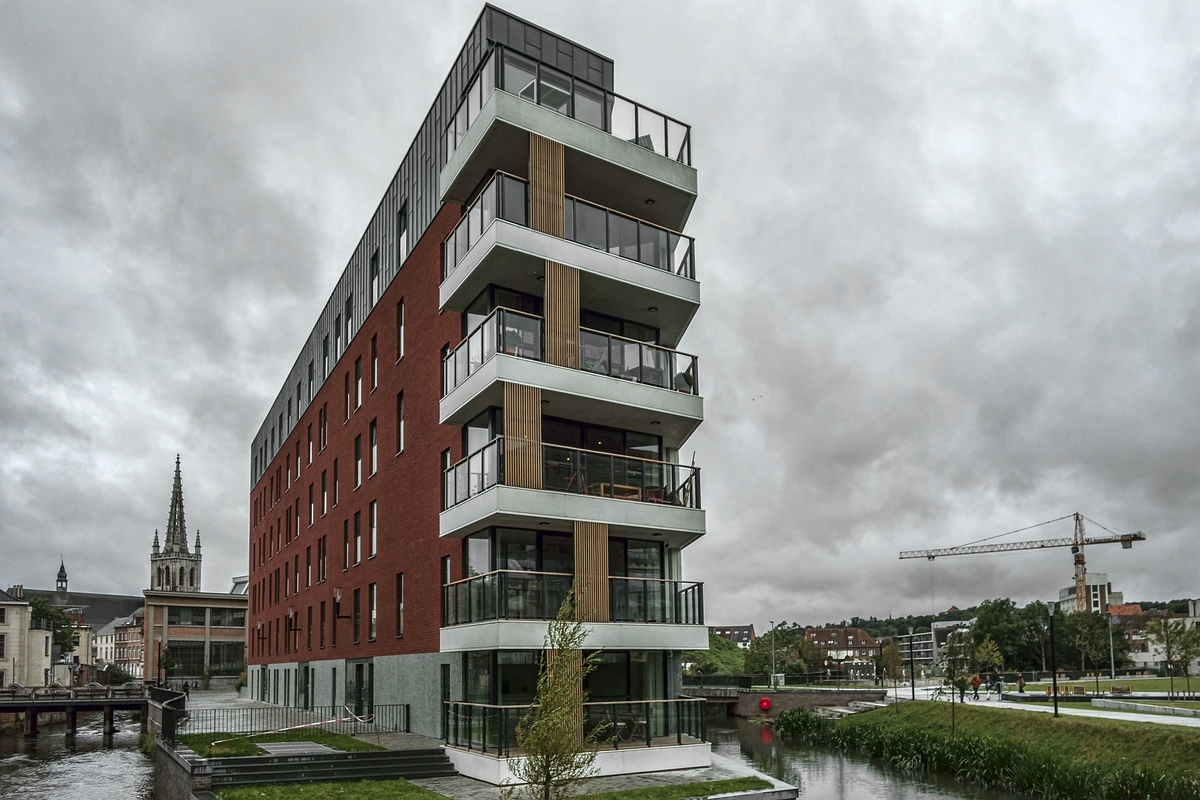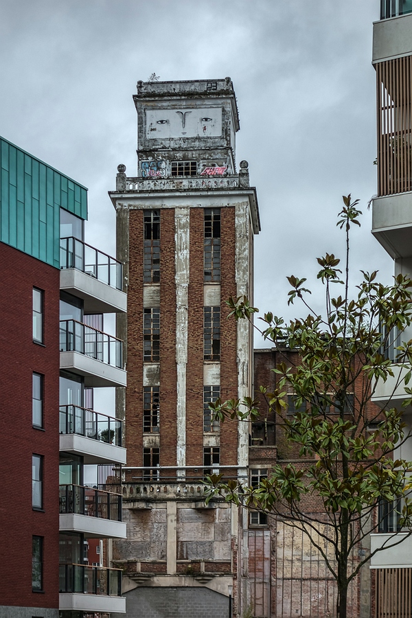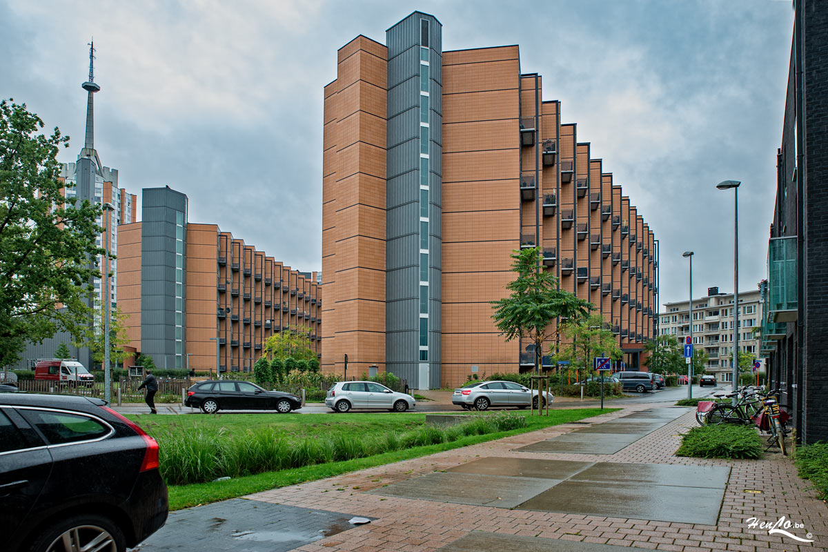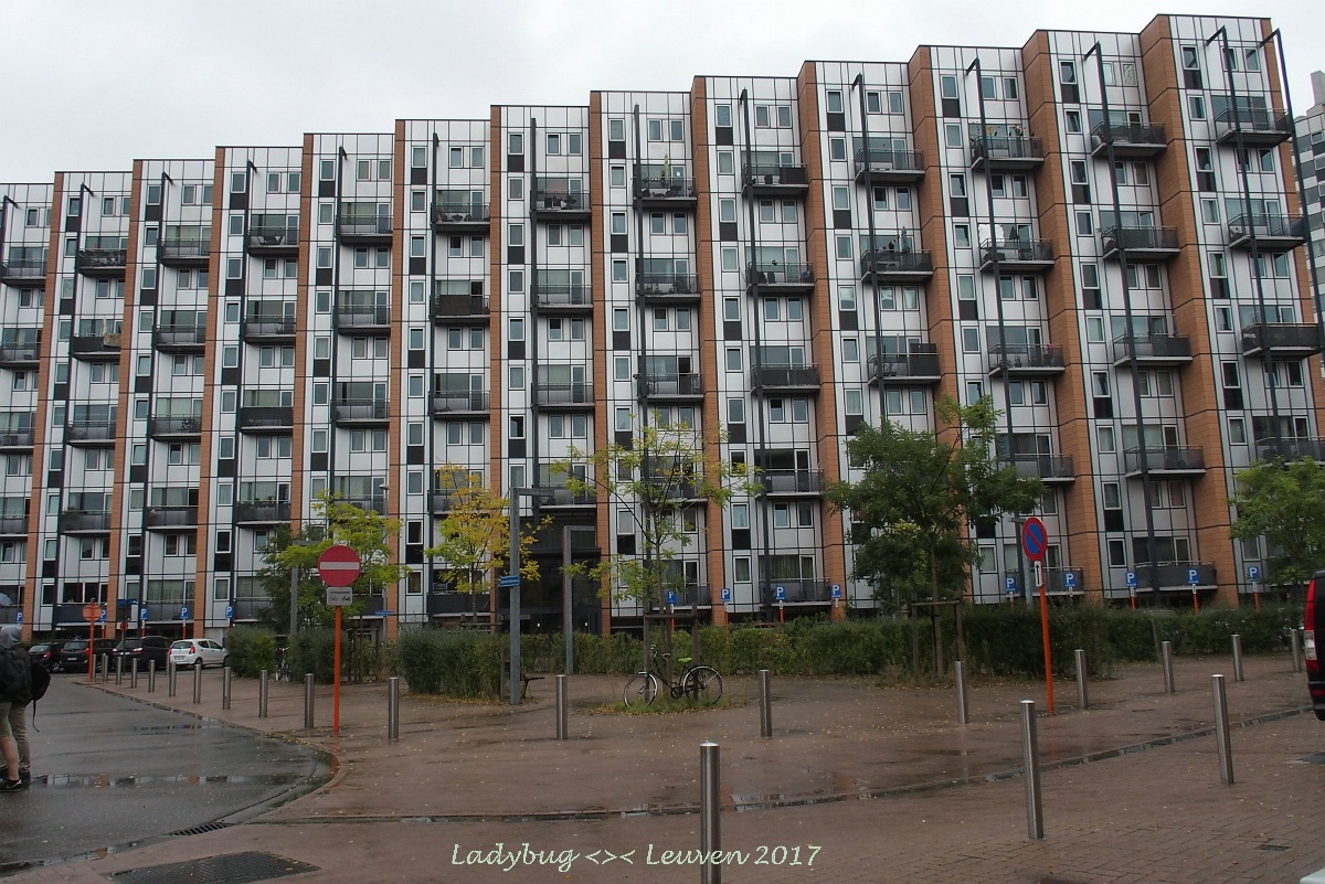 Het volgende thema van de wandeling was ‘het nieuwe wonen in Leuven’. Marsje leidde ons naar de nieuwe flatgebouwen die opgetrokken werden en nog worden op de oude terreinen van o.a. de brouwerij Stella Artois. Daarna wandelden we verder naar de sociale woonwijk Sint-Maartendal. Deze appartementsgebouwen werden onlangs compleet gerenoveerd en zijn gebouwd op de terreinen van een oude kazerne.