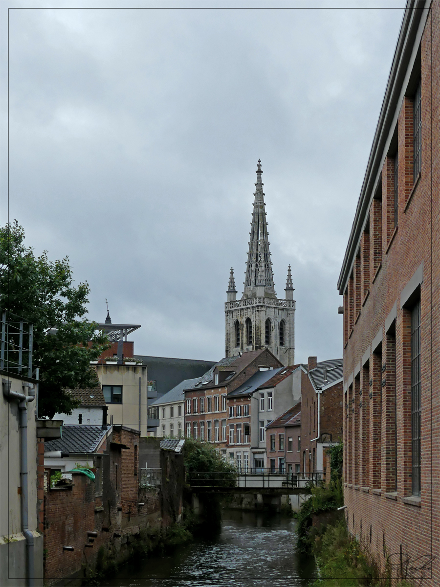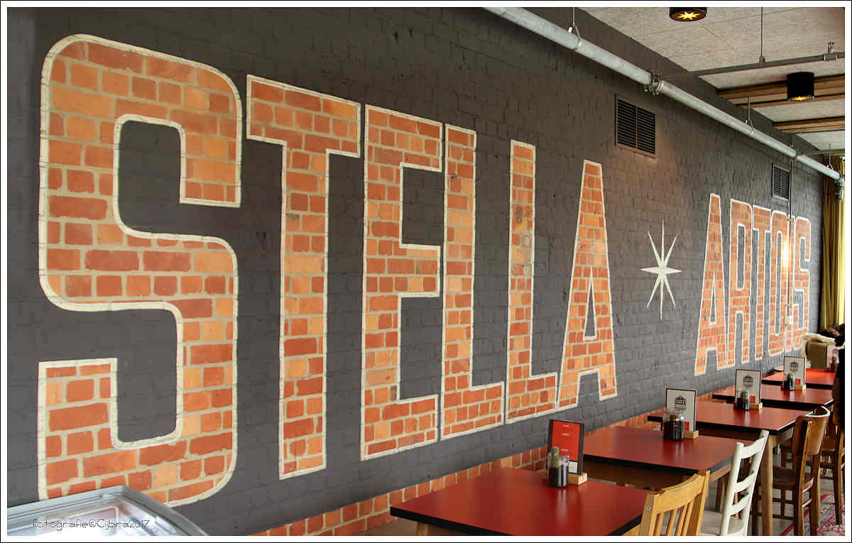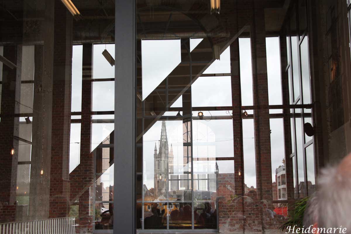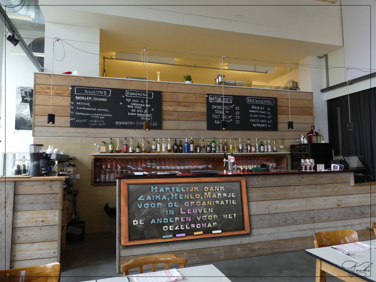 Na een omwegje via de sluizen waar de Dijle de vaart van water voorziet, gingen we naar het restaurant. Precies op tijd kwamen we aan bij het Grand Café De Hoorn, gevestigd in de oorspronkelijke brouwerij van Stella Artois. Een industrieel gebouw, compleet gerenoveerd en ingericht tot een gezellig restaurant met prachtig uitzicht op de kerk.