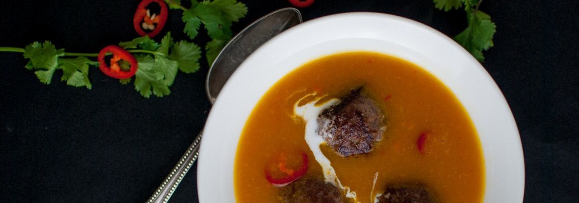 Pittige pompoensoep met gehaktballetjes