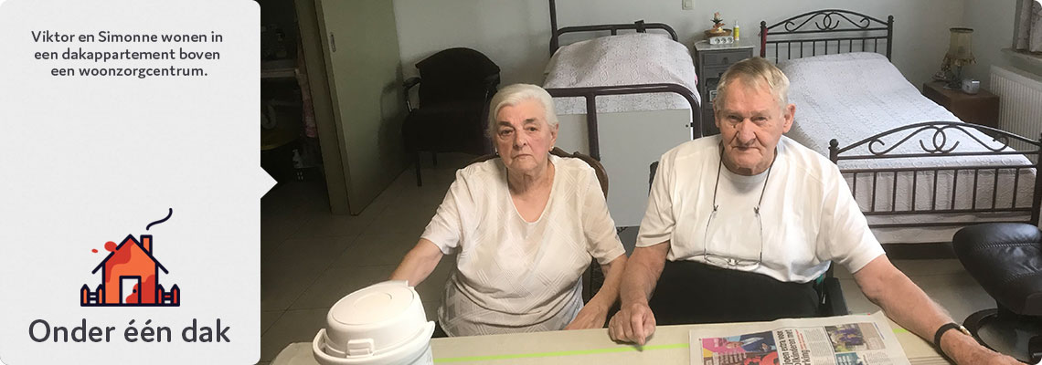 ‘Meer hebben we niet nodig. We zijn héél erg gelukkig hier. Ik zou me niet kunnen voorstellen dat we gescheiden zouden moeten leven, Viktor en ik. Liefst willen we samen sterven. Maar ja, samen doodgaan, dat bestaat niet, hé. Wij willen samen blijven tot één van ons sterft. Ooit zal één van ons alleen vallen. Dat is dan de sukkelaar. Maar zolang het gaat, genieten we beiden. Hier zijn ook verjaardagsfeestjes of andere samenkomsten in het rusthuis, en soms gaan we daar naartoe. Ik doe graag eens mijn klapke met de mensen. Met Victor is het soms moeilijk praten. Een hoorapparaat helpt niet. Ik moet roepen in zijn oor. Maar als ge 70 jaar getrouwd zijt, hebt ge niet veel woorden nodig. Dan verstaat ge elkaar door in elkaars ogen te kijken.’