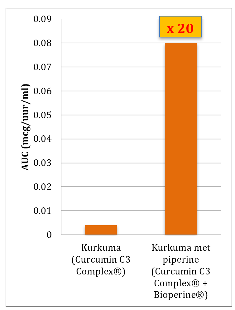 Figuur. De totale blootstelling van het lichaam (AUC) aan de werkzame stoffen uit kurkuma is 20 maal hoger na gebruik van “kurkuma met piperine” dan na gebruik van kurkuma apart. (2)