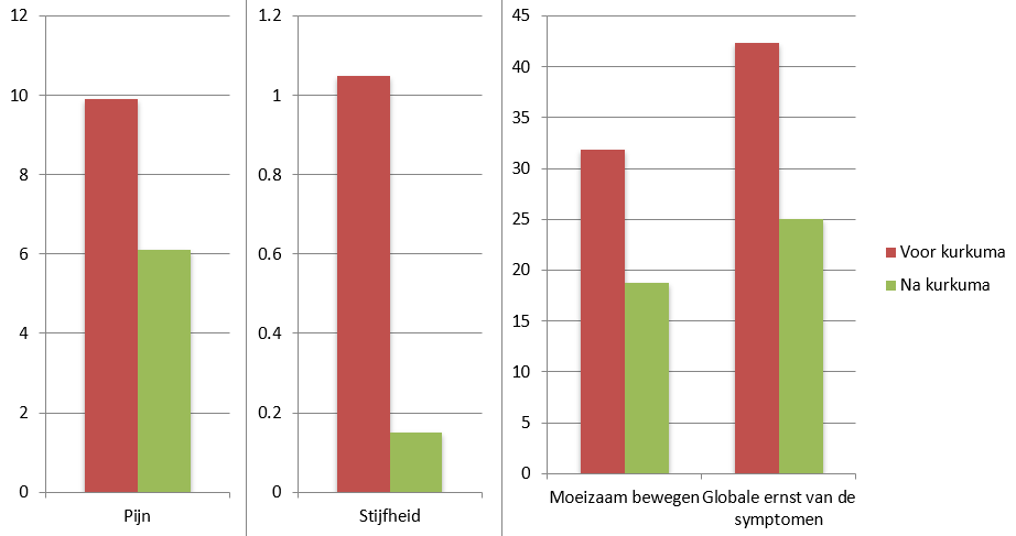 - kurkumagebruikers konden na amper 6 weken reeds veel vlotter traplopen, autorijden, boodschappen doen, uit bed komen, enz.