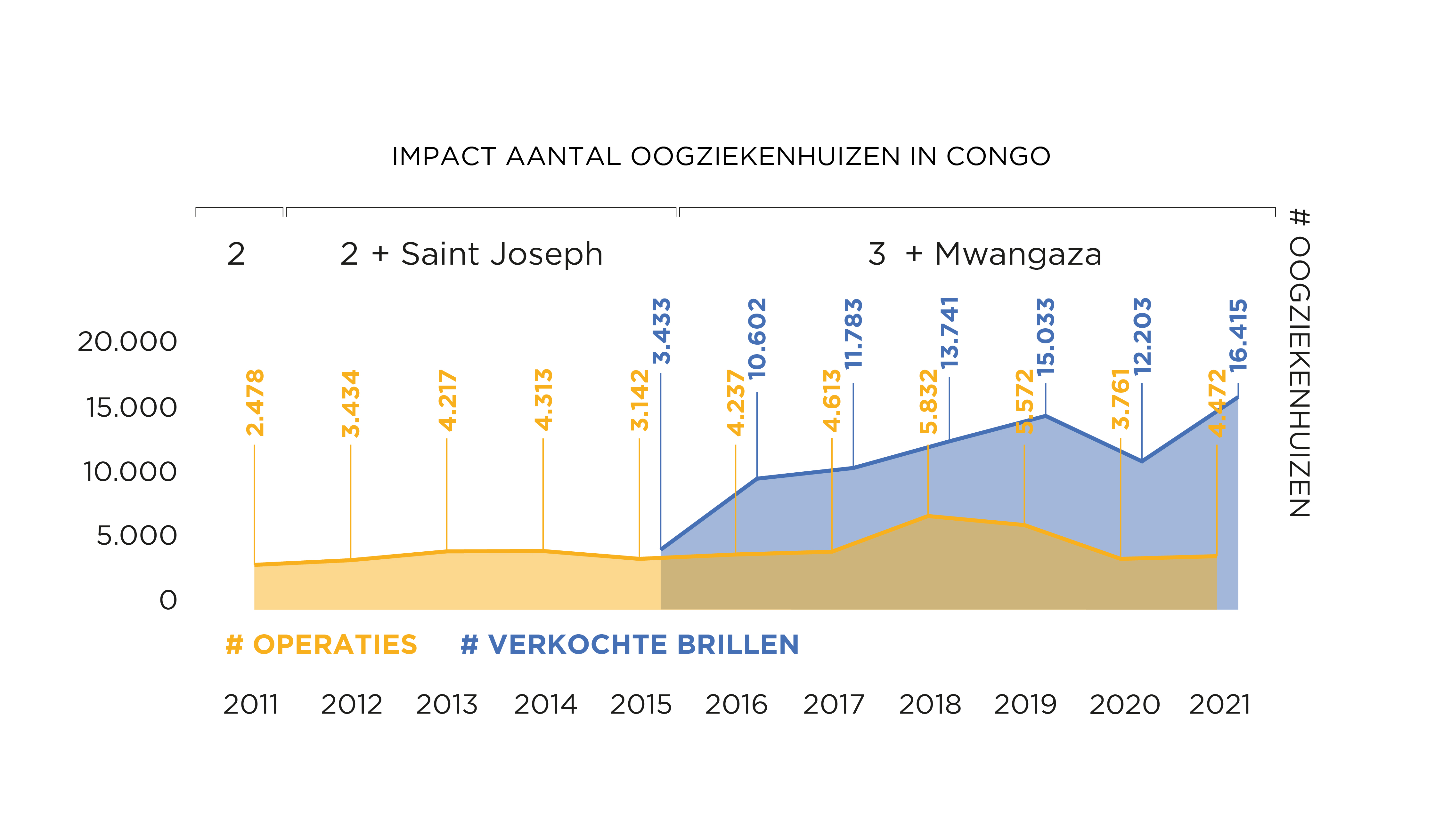 De bouw van oogziekenhuizen in grote stadsagglomeraties leidt tot een constante stijging van het aantal consultaties. In 2011 stond de teller nog op zo’n 35.000. Na de opening van twee bijkomende oogziekenhuizen, steeg dit tot meer dan 100.000 consultaties, met een dip tijdens de ‘coronajaren’ 2020 en 2021. Ook het aantal chirurgische ingrepen en verkochte brillen kent een stijging:
