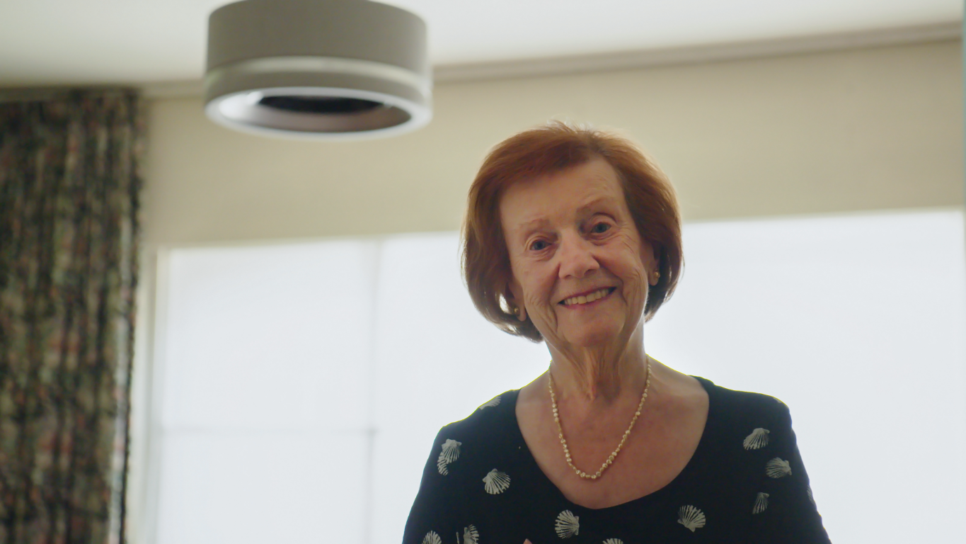 Florentina woont op het gelijkvloers van een kangoeroewoning, met haar dochter Helga op de bovenverdieping. Het eerste wat opvalt bij Florentina thuis is… dat er niets bijzonders opvalt. Tot ze ons op de lampen aan het plafond wijst. De elegante Nobi-lampen zitten vol met spitstechnologie. “Die lampen waken dag en nacht over mij,” vertelt Florentina. “Als ik zou vallen, dan verwittigen ze meteen mijn dochter.